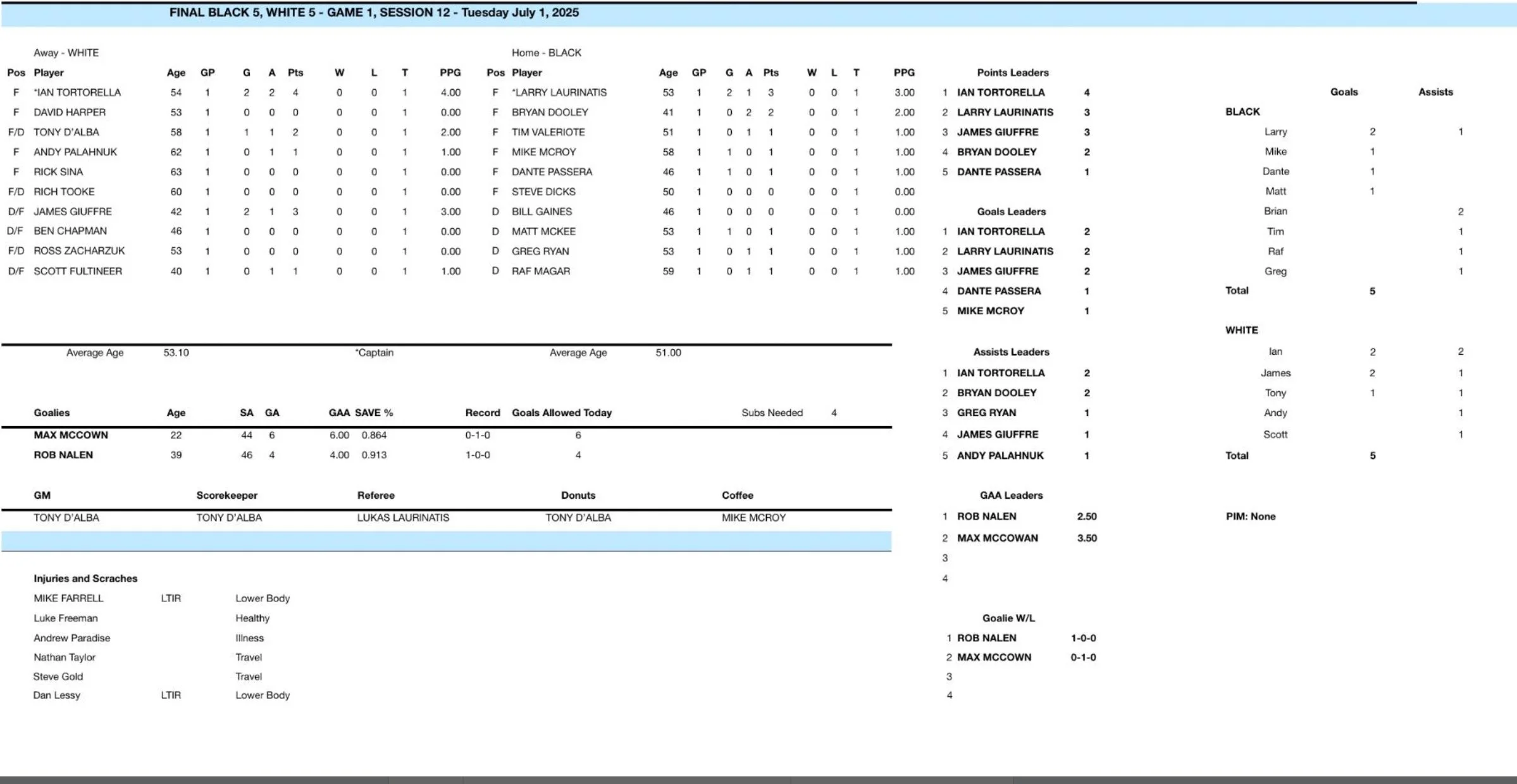 That was a good one. Maybe next time we’ll run a short OT period to break the tie. Can I get a vote on that? Heres the game stats and leaderboard for the new season. Nice to see a few new names on there and spread the wealth a little bit!