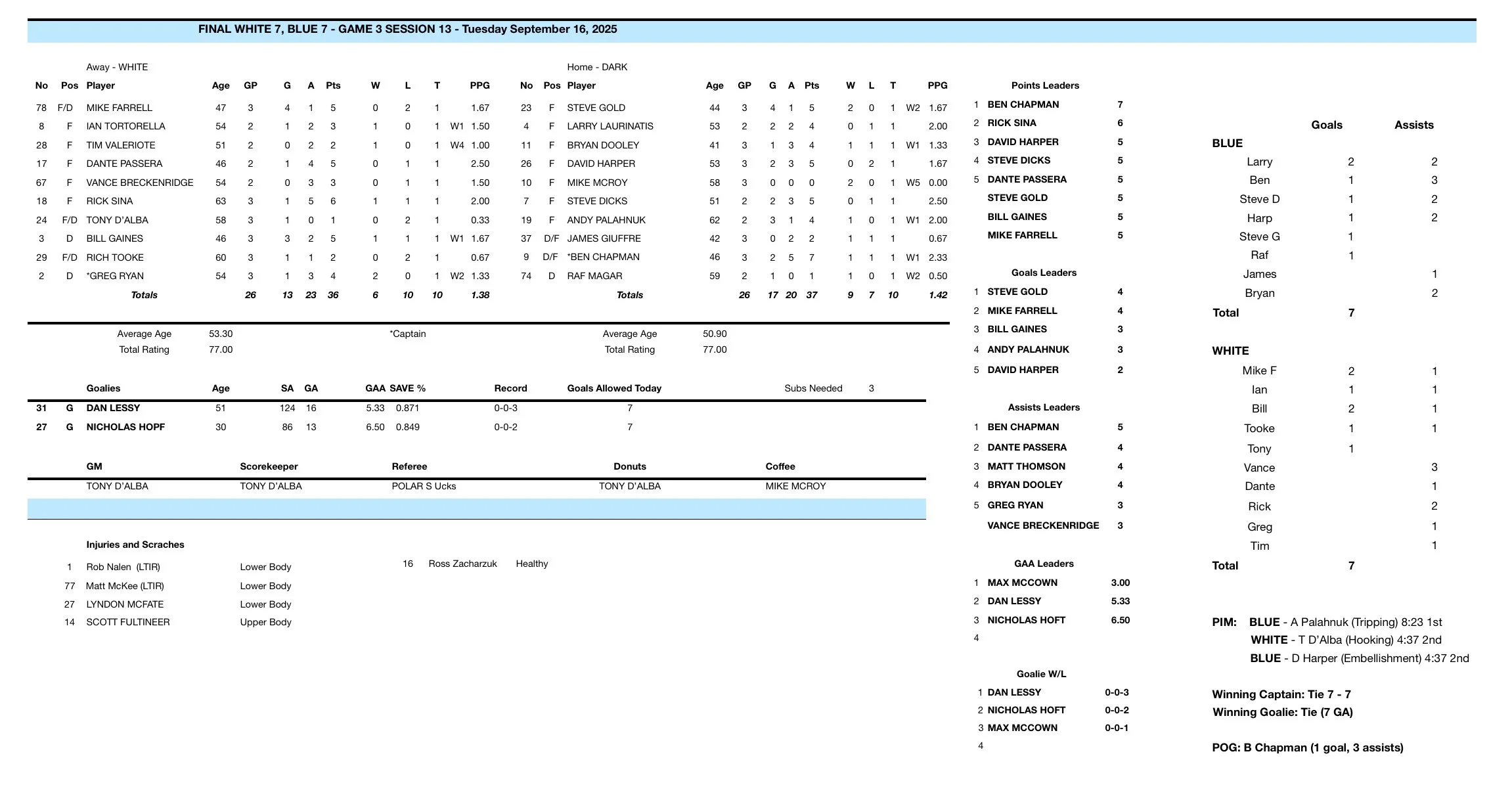 Seemed like every time White tied it, Blue would have a quick answer to go up by another goal. @Larry Laurinatis with a couple of goals to lead Blue, while @Mike Farrell and @Bill Gaines each had two for White. Down by two late, White got one at 4 mins and then again under two mins to knot it at 7. Couple of chances at the end, but a fitting tie, 7-7 final.