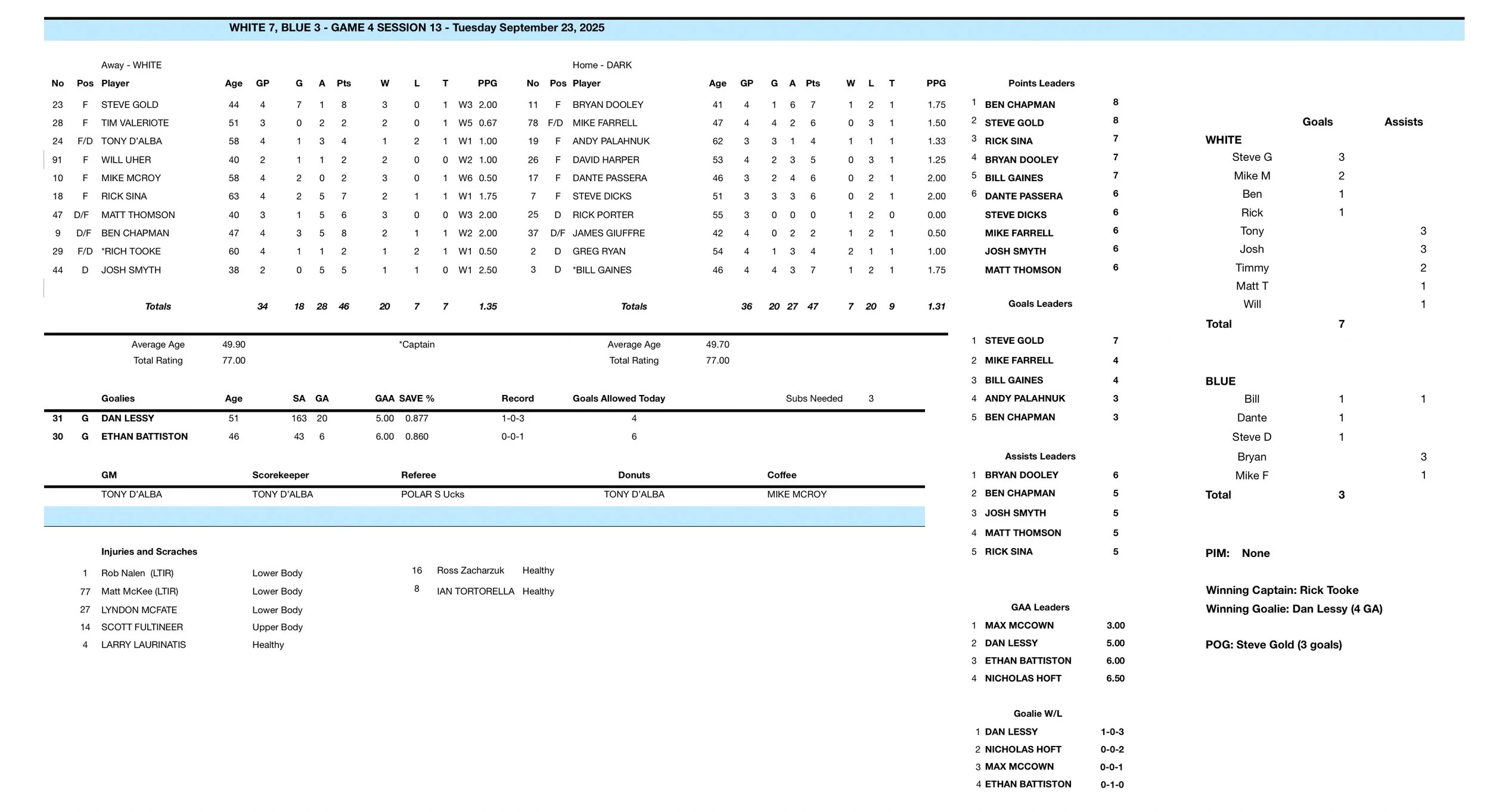 Midway through the second, goals by @Stephen Gold and @Mike McRoy broke things open at a time where Blue was buzzing the net but couldn’t get one in. Couple more late ones and White takes the 7-3 win. Congrats to Captain @Rich Tooke who managed and inspired the team, and it took four games but we have a winning goalie @Dan Lessy (G) after three goalie ties.